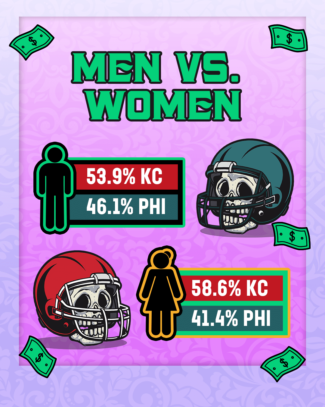 One of the more interesting trends we noticed while parsing data was that women, overall, are backing the Chiefs at a higher rate than men. Whether the Travis Kelce / Taylor Swift connection has something to do with this remains to be seen – but the data is clear: