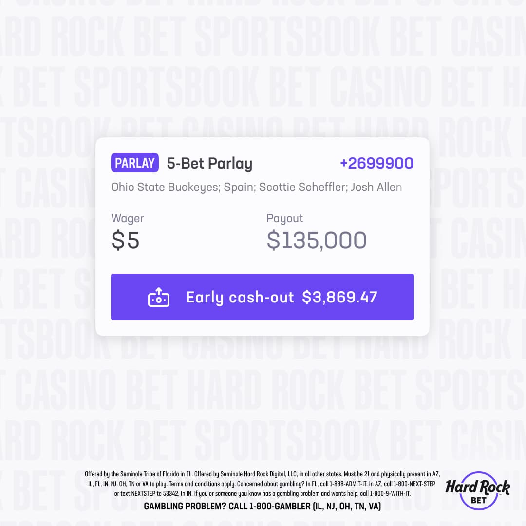 Offered by the Seminole Tribe of Florida in FL. Offered by Seminole Hard Rock Digital, LLC, in all other states. Must be 21+ and physically present in AZ, CO, FL, IL, IN, NJ, OH, TN or VA to play. Terms and conditions apply. Concerned about gambling? In FL, call 1-833-PLAYWISE. In IN, if you or someone you know has a gambling problem and wants help, call 1-800-9-WITH-IT.