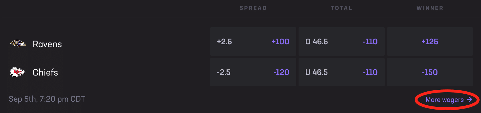 If you’re looking at the individual games the Hard Rock Bet sportsbook will initially show football odds for the spread, total, and winner (also known as a moneyline). However, you can click the ‘More wagers’ button in the bottom right corner to see every individual bet that’s available within that game – from player props to alternate spreads.